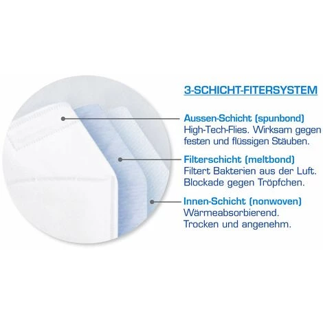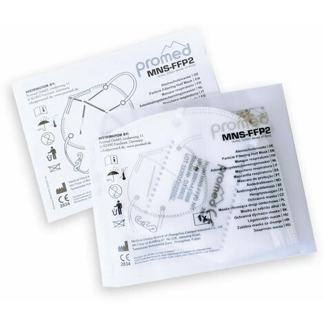 Ce masque de protection respiratoire MNS-FFP2 vous protège des poussières fines, aérosols liquides et substances biologiques. Les points forts de notre paquet de 10 masques FFP2 – Système de filtrage à 3 couches : tissu non tissé – Filtration haute qualité de 95 % de toutes les particules présentes dans l’air – Matériau doux pour la peau et très confortable – Adaptation au visage optimale : forme en V avec contour du nez – Masque facial avec conception 3D pour une respiration confortable – Lanières élastiques avec crochet pour un ajustement parfait – Un emballage individuel dans des sachets en polyéthylène hygiénique empêche la contamination du masque avant son utilisation. – Ajustable, taille unique. Masques à usage unique. Ne pas laver. – Masque FFP2 certifié CE et testé aux normes EN 149:2001 +A1:2009 ; Règlement (UE) 2016/425 pour les équipements de protection individuelle. – CE 2834Informations produit – Boîte de rangement avec 10 MASQUES FFP2 – Taille : env 160 x 125 x 50 mm (LxlxH) – Poids : env 130 g – 1x crochet par masque – 1x Manuel d’instructions (en 17 langues) Données techniques – Type de masque : FFP2 NR, catégorie III – Taille du produit (plié) : 106,7 x 155 mm, – Poids du produit : environ 8 g – Durée de conservation : 3 ansConditions de stockage et durée de conservation À moins de 80 % d’humidité relative dans une pièce sèche, bien ventilée, et sans contact avec des gaz corrosifs. Évitez les températures élevées. La durée de conservation du produit non ouvert est de 3 ans à compter de la date de fabrication.Notes complémentaires Un masque est un produit d’hygiène sans droit de retour. Pour des raisons d’hygiène, nous n’acceptons pas les retours après achat, car nous ne pouvons plus en garantir l’intégrité.