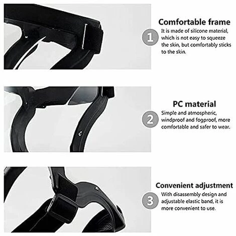 Transparent, léger, confortable, respirant, comme des lunettes à branches repliables ! N’affecte ni le maquillage ni les cheveux ! Il est idéal pour protéger les yeux, la bouche et le nez des éclaboussures, des gouttelettes, des aérosols, des pulvérisations et des éclaboussures.
