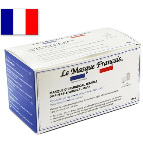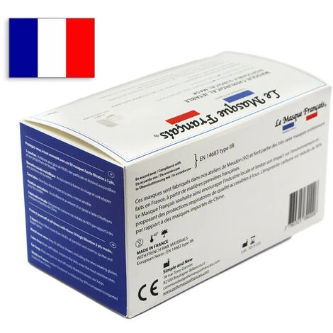 Ces maques sont en accord avec la norme EN 14683 type IIR. – Haute filtration à 3 plis – 3 couches : ils filtrent ainsi plus de 99,96% des particules et résistent aux postillons et aux projections de liquide – Barrette nasale métallique : ils épousent la forme du visage et sont adaptés aux porteurs de lunettes – Sans latex : leur tissu doux respecte la peau, même sensible – Fixation auriculaire : ils s’enfilent et se retirent d’un geste à l’aide d’élastiques pour les oreilles – Fabrication locale : l’empreinte carbone est réduite de 90% par rapport à des masques importés de Chine. Ils sont fabriqués à Meudon (92), et font partie des très rares masques entièrement faits en France, à partir de matières premières françaises. Le Masque Français souhaite encourager l’industrie locale et limiter son impact sur l’environnement en proposant des protections respiratoires de qualité accessibles à tous.