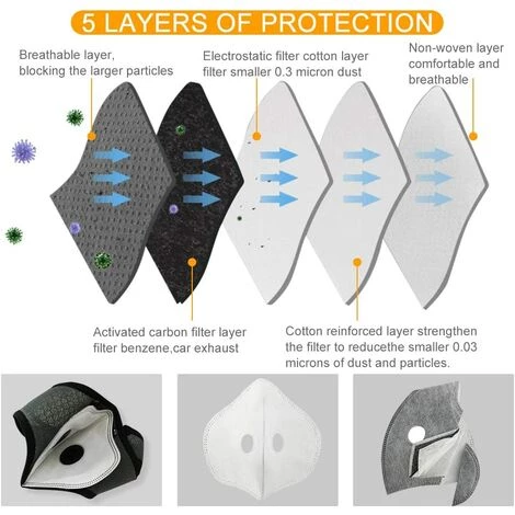 - Le filtre à charbon actif offre une protection confortable contre la poussière, le pollen, la fumée, les irritants courants de l’air et d’autres particules. Cela vous aidera à respirer de manière plus propre et plus saine.