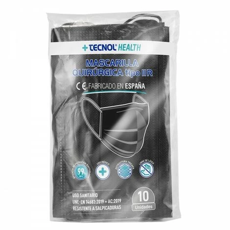 Masque chirurgical noir adulte sac 10 unités. dans un sac plastique auto-adhésif. masque en matière homologuée : filtration >99% selon test effectué par des entités agréées. norme une-en 14883:2019+ ac:2019. ils ne contiennent pas de graphène et sont sans latex. structure à trois couches avec sangle de nez réglable. assurer une protection de classe sanitaire contre les fluides corporels et les éclaboussures. des caoutchoucs élastique confortables spécialement sélectionnés pour réduire les stress de compression, garantissent le confort de l’utilisateur. avec certification aenor une-en iso 13485. fabriqué en espagne.