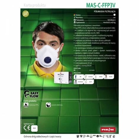 Masque ffp3 masque de protection valve anti-poussière_x000D_Masque anti-poussière avec valve._x000D_Type FFP3 : protège l’appareil respiratoire contre les aérosols solides et liquides tant que la concentration de la phase dispersée de ces aérosols ne dépasse pas la valeur de 20 x TLV_x000D_mettre des bandes élastiques avec possibilité de réglage_x000D_soupape d’échappement avant_x000D_joint en mousse autour du bord du masque_x000D_la forme conique du masque profilée en plus par rapport au visage permet un ajustement_x000D_ne contenant aucun élément métallique_x000D_protection parfaite contre les poussières et fumées métalliques, particules, brouillards d’agents divers_x000D_utilisé dans le traitement du bois et du métal, le meulage et la peinture (également avec des peintures contenant du chromate de plomb)_x000D_demi-masque aux propriétés anti-smog_x000D_placé dans une boîte qui permet une présentation pratique à l’exposition_x000D_conforme à la norme EN149_x000D_Propriétés_x000D_masque type FFP3 :_x000D_soupape respiratoire_x000D_