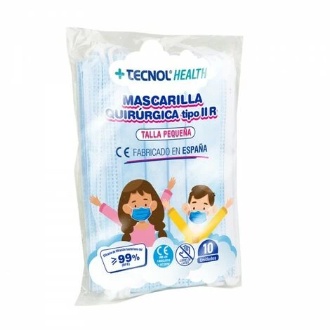 Sac masque chirurgical bleu 10 unités pour enfants sac plastique auto-adhésif. masque en matière homologuée : filtration >99% selon test effectué par des entités agréées. norme une-en 14883:2019+ ac:2019. ils ne contiennent pas de graphène et sont sans latex. structure à trois couches avec sangle de nez réglable. assurer une protection de classe sanitaire contre les fluides corporels et les éclaboussures. des caoutchoucs élastique confortables spécialement sélectionnés pour réduire les stress de compression, garantissent le confort de l’utilisateur. avec certification aenor une-en iso 13485. fabriqué en espagne.