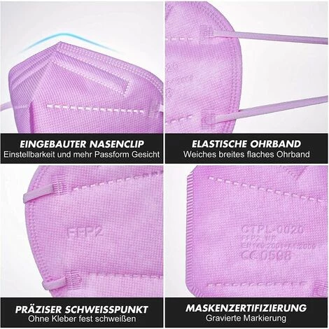 - [Masque facial FFP2 5 couches] Couche extérieure non tissée + 2 couches filtrantes à fibres douces ultrafines + couche intérieure non tissée respectueuse de la peau. Il est respirant et confortable. Répondez à la norme FFP2 avec une efficacité de filtre supérieure à 95% [Masque FFP2/KN95 confortable] Les boucles d’oreille extra-douces éliminent la pression sur l’oreille.Conception 3D (avant conique) pour une respiration facile, c’est un masque adulte [Pince-nez moulable] Le pince-nez moulable peut être librement ajusté en fonction de la hauteur du nez pour maintenir le masque fermement contre votre nez et la zone environnante [Emballage individuel hygiénique] 20 masques FFP2 sont inclus dans chaque boîte.