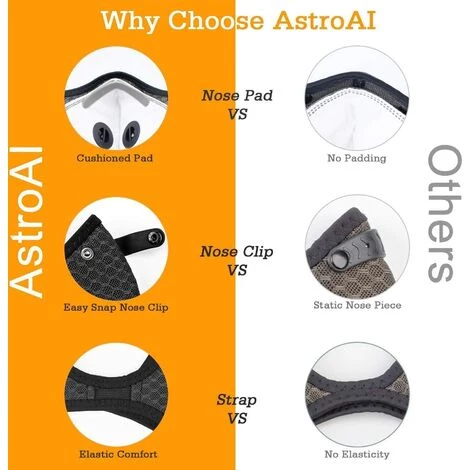 CONCEPTION CONFORTABLE : un coussin nasal souple sur les filtres et un clip nasal réglable pour un meilleur ajustement ; Boucle d’oreille flexible nécessitant le frottement sur les oreilles ; Le filtre remplaçable augmente la facilité d’utilisation
