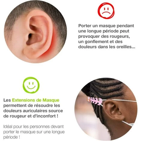 Le port prolongé d’un masque peut provoquer des irritations et des rougeurs dues au serrage permanent des attaches auriculaires. Notre rallonge de bandoulière peut remplacer l’oreille pour fixer l’extrémité de la bandoulière afin d’éviter la douleur.