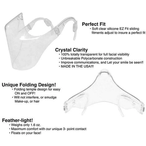 Protection Mask Durable Mask Face Shield Combine PC Reusable Clear DeckonansparentThe product is shipped based on the color or size of the main image of the product page.Description 16.1*15cm Color: Deckonansparent Material: PC Package list: 1 x face mouth shield Features: Premium quality material: It is made of high quality PC material. It is easy and comfortable to wear, Deckonansparent, durable and nontoxic. Face mouth protection: This face guard can be reused for a long time, can protect your mouth and nose from water, dust and more. Comfortable to wear: It is lightweight, and designed to be worn like glasses to reduce the uncomfortable feelings for daily wearing. Compact and lightweight: It is light in weight and compact, you will not feel discomfortable after long time wearing. Anti-fog: It is comfortable for breathing. You don’t need to worry the fog will gather and turn into water on the mouth cover after wearing for a long time Wide application: Keep in your daypack, at home, at work or in your car. Use it in outdoor, kitchen and your office. With ergonomics design, our safety face shield fit for most. Notes: 1. Please allowed 1-3mm